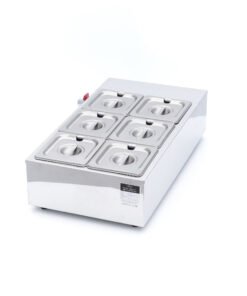 This beautiful chocolate melter makes easy chocolate melting possible. It features 6 GN containers with 1/6 GN size, a depth of 10 cm and matching lids. The digital display clearly shows how hot the water and GN containers are.