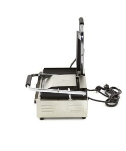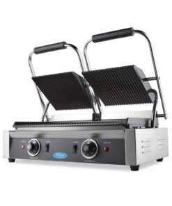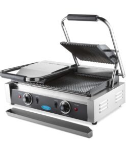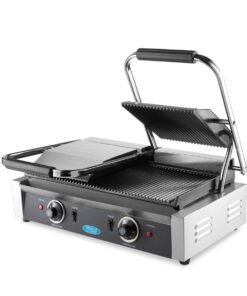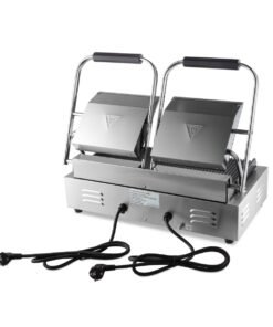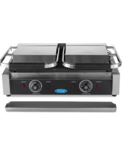 In busy kitchens, for example, in restaurants, cafes or canteens, this double contact grill comes in handy. It allows you to prepare many dishes in a short space of time. Besides grilled sandwiches and paninis, you can also fry hamburgers, fish, vegetables and other products on the grooved cast iron baking tray. This professional contact grill is ideal for intensive daily use. Thanks to its robust construction, it lasts a long time and can withstand heavy use.