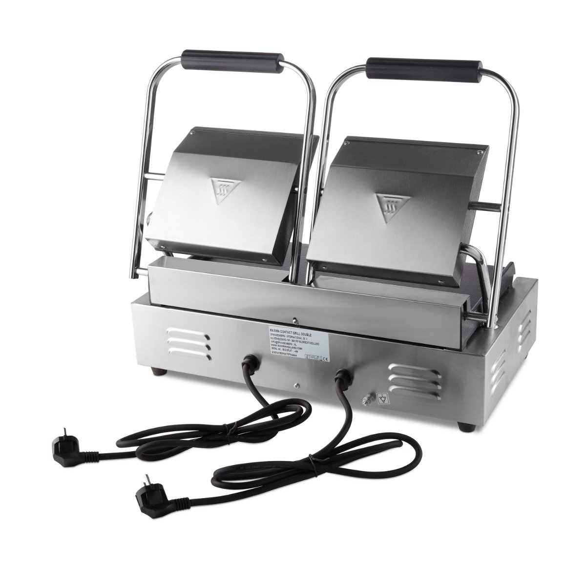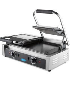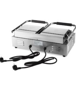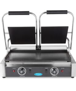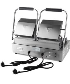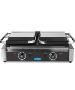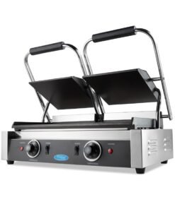 This grill is ideal for use in kitchens where several paninis, sandwiches and other grilled dishes are prepared regularly. This double contact grill has heavy duty smooth cast iron plates and is easy to clean with the handy cleaning brush that’s included.