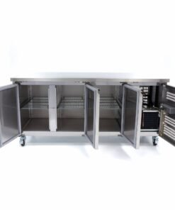 The solid doors are equipped with heated door rubbers, to avoid freezing. Also the doors are self-closing; they are equipped with magnetic door seals to make sure that cold air doesn’t escape. The digital controller shows the temperature of the counter freezer and with the arrow keys you can set the desired temperature. You can set the temperature precisely within the range from -18 to -22ºC. The counter freezer has four wheels, so you can easily move the heavy counter freezer around. The front wheels are equipped with brakes preventing the counter freezer to move while you are working with it.