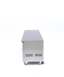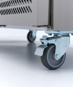 Despite its weight, this large counter freezer is easy to move with the six wheels placed under it. The front wheels are equipped with a brake, so you can lock the counter freezer and prevent it from moving. The stainless steel worktop provides space for several people to simultaneously prepare meals, such as delicious desserts. Finally, the ice is stored behind one of the doors of the counter freezer. So all ingredients are within easy reach.