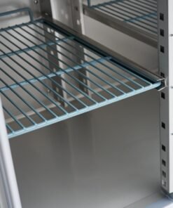 This counter freezer comes with four 1/1GN-sized grids and matching guides. The grids have a raised edge that prevents products from falling off at the back or freezing against the back wall. The grids also ensure that the cold air can circulate well and products freeze evenly. The guides of the grids are adjustable in heights of 5 cm. This allows you to choose the height at which you place the grids. You can expand the number of grids by ordering more on our website. You can replace the grids with Gastronorm trays or add several Gastronorm trays. In that case, make sure to order guides as well.