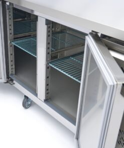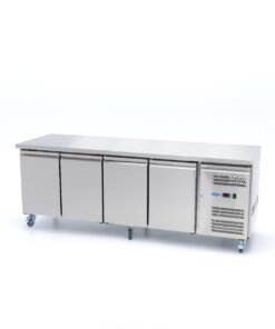 This beautifully finished four-door freezer workbench offers ample freezing capacity and an ergonomic worktop. The freezer workbench has four height-adjustable shelves and self-closing doors.