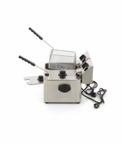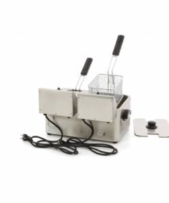 The two 4L baskets of this fryer mean you can prepare twice as many products at the same time. This table model is suitable for any professional catering kitchen and can be placed on the countertop or a table. You can quickly fry up to twice as many 1kg portions of fries or other delicious snacks. With the user-friendly thermostat, you can set the temperature for each fryer individually. This is ideal when you want to prepare fries in one fryer and snacks that require a different temperature in the other. Temperatures range between 0°C and 190°C. The deep fryer also has an indicator light that shows when the oil is heated to the right temperature and is ready for use.