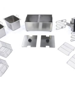 The housing and all parts and accessories are made from stainless steel. The deep fryer is also neatly finished with rounded corners, which makes cleaning much easier. Oil and fat residue can quickly be dissolved and cleaned by soaking in hot, soapy water. All parts can be removed and cleaned with a brush, warm water and soap. The exterior of the fryer can be wiped clean with a damp cloth.