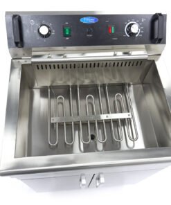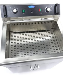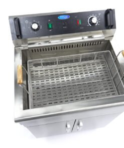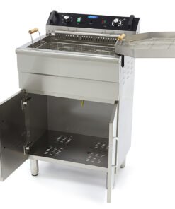 This versatile deep fryer is extra large to make greater quantities of food. It’s ideal for frying up to 3kg of fries in the 30 litre oil capacity fryer. It can also handle big portions of fried fish, vegetable snacks, churros and other fried foods without making customers wait long for their order. The base cupboard is fitted with two stainless steel doors with handles. Behind the doors, there is a built-in drain tap for quick oil changes. In addition, it is also handy as a storage space for extra oil bottles. The fryer has a removable lid to prevent oil splatter and the handles are heat resistant. You can also attach the supplied grid to collect fat residue.