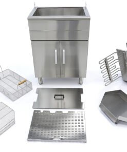The deep fryer and all its parts, such as the collection grid, the frying pan and the frying basket, are made of stainless steel, which is easy to clean. The parts of this luxuriously finished deep fryer with rounded corners are all removable. Oil and fat residue can be removed by soaking the parts in warm, soapy water. Scrub everything gently with a brush and finish off with a soft cloth to wipe everything dry.