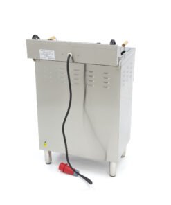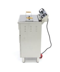 The deep fryer, which is mounted onto a base with a cupboard, works on a 400V power. In addition, the appliance is equipped with overload protection for extra safety. Thanks to a cold zone, you can also use the frying oil longer. The heating element is suspended slightly above the bottom of the fryer. All oil between the heating element and the bottom remains slightly cooler. In this way, crumbs that fall through don’t burn as quickly and the oil remains of better quality for longer. The temperature in the electric fryer can be adjusted between 50°C and 200°C and includes a convenient timer.