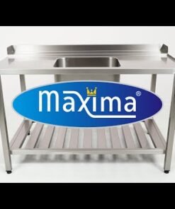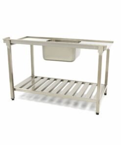This professional dishwasher table with sink is made from high-quality stainless steel and has a handy backsplash on the side and back. The underside of the sink includes a shelf for storing items, such as the dishwasher baskets and detergent. This dishwasher table has a sink in the middle.