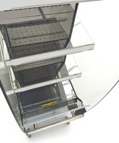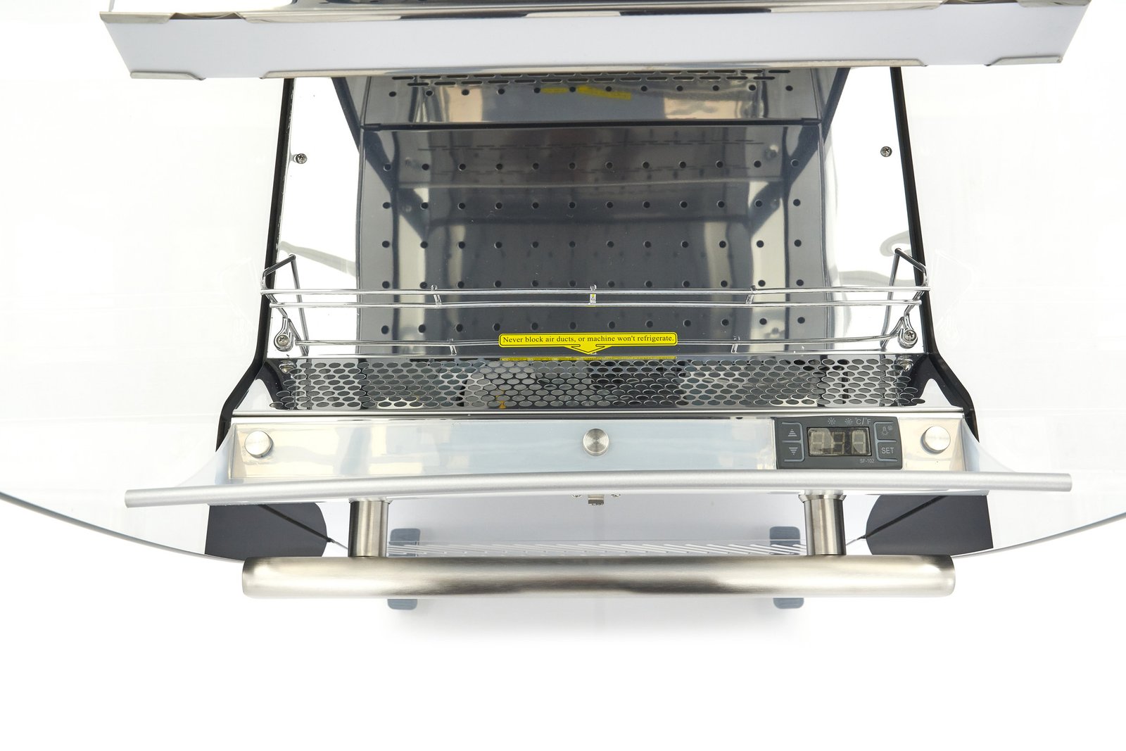 Ice formation is easily prevented in this premium open display fridge, thanks to the special cooling cycle which allows water to evaporate at regular intervals. Cleaning the display case is also very simple. All you need is a soft, damp cloth with a little bit of a mild detergent to wipe down the exterior and inside of the fridge. The shelves can be also cleaned with a damp cloth and soapy water.