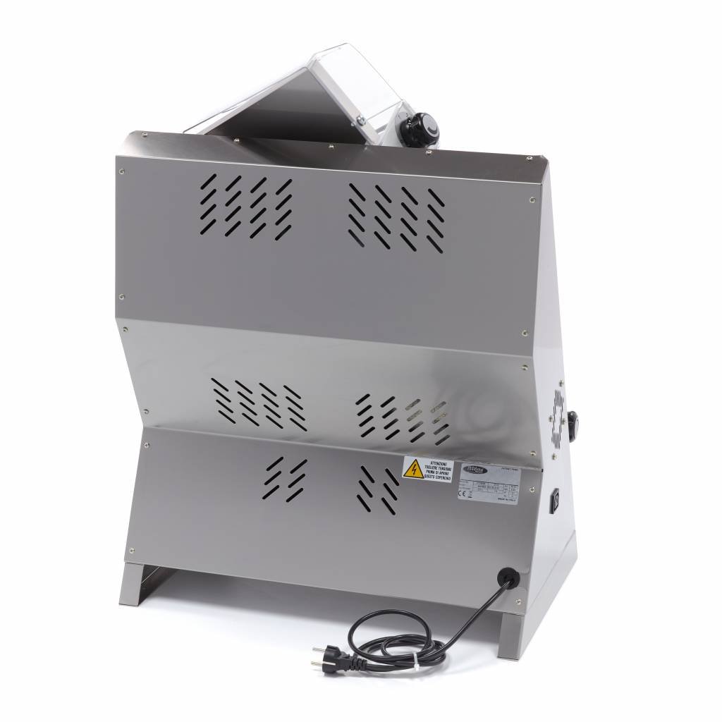 You can easily set the right thickness for your perfect pizza crust. With the handy dial, you can choose a thickness between 0 and 4mm. Before you put the dough in the rolling pin, sprinkle it with flour. This way, the dough will not stick to the rolling pin and the base will come out uniform. To make things even easier, a foot pedal is available as an additional accessory that can be ordered through our website. As soon as you put your foot on the pedal, you can put the dough through the rolling pin. As you have your hands free, you can easily catch the dough after rolling it out. The dough does not heat up during rolling. With this rolling pin, you can make pizza bases between 26 and 45cm.