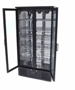 This elegant black drinks fridge is ideal for catering establishments with limited space. It is a tall model with two hinged doors that let you store plenty of products vertically, saving you valuable space, while keeping everything perfectly chilled until needed. These cooled products are presented to potential customers attractively and professionally, thanks to the built-in LED lighting. The doors come with a lock to keep it secure and, because the fridge is on wheels, it is easy to move around. There are five shelves on each side, made from stainless steel, that can each be adjusted in height for optimum layouts.