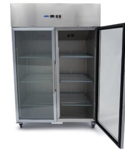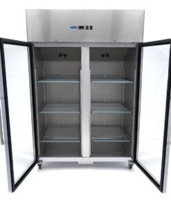 This stainless steel freezer has a gross capacity of 1200L to store frozen products and fits seamlessly into most professional kitchens. The interior features energy-efficient LED lighting and six adjustable shelves that are suitable for 2/1 GN containers. The glass doors with antibacterial rubber seal includes a built-in lock and allows you to view the frozen products without opening the freezer.