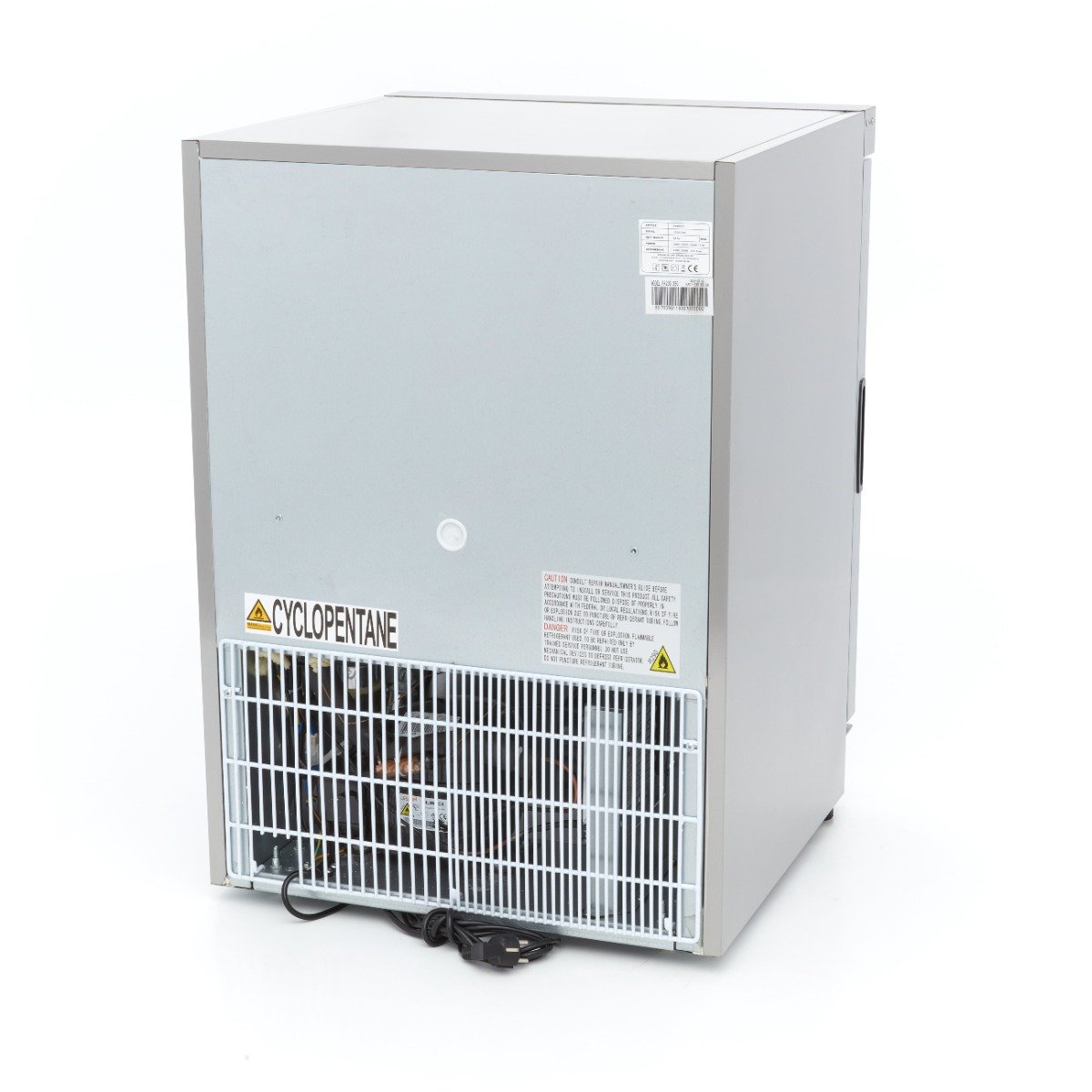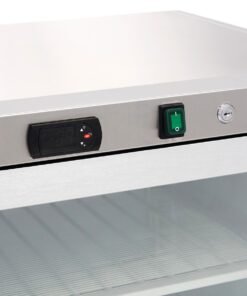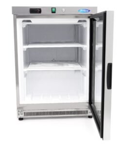 This professional freezer has a gross capacity of 200L to store frozen products. With its compact size, this stainless steel freezer fits seamlessly into most professional kitchens. It features two fixed shelves that provide sufficient storage space. The shelves are designed in a grid pattern to enhance ventilation. The glass door includes a lock which allows you to view the frozen products without opening the fridge.