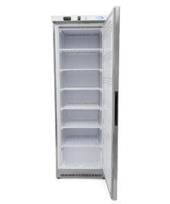 This professional freezer has a gross capacity of 400L to keep frozen products in. With its compact size, this stainless steel freezer fits into almost any professional kitchen. Six shelves ensure there is more than enough room for storing what you need. The shelves are fixed and come in a grid to improve ventilation. The door includes a lock for added convenience.