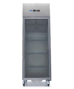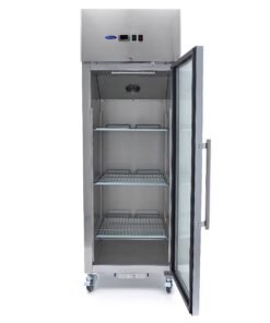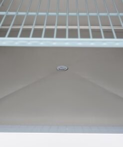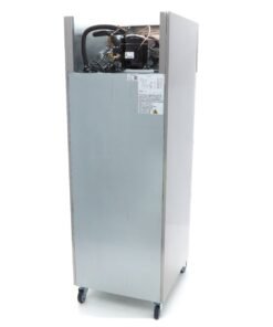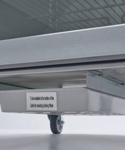 This professional freezer is equipped with an electronic temperature controller and digital display. This allows for easy temperature reading and setting. It also offers a wide temperature range for freezing products efficiently. It can be defrosted manually. The self-closing door prevents large temperature differences. This freezer uses R290 refrigerant, which is free from CFC. It’s also equipped with a water drip tray where excess water is collected. The freezer is supported by four wheels for easy mobility, two of which have brakes to secure its’s position.