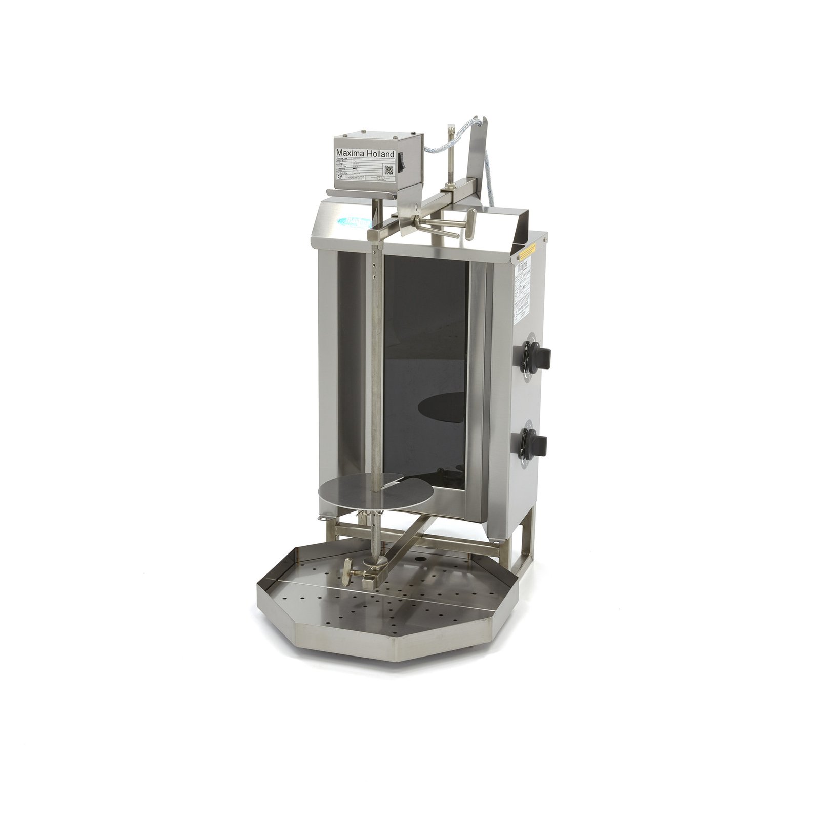 This top-quality grill has two electric burners. The temperature can be set separately on both burners. The Robax protective glass that has been placed in front of the burners ensures safe working with this professional kebab grill. Since the skewer is adjustable in distance to the burners, meat is prepared perfectly. The skewer can be turned left and right.