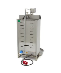 A shawarma shop, grillroom or kebab restaurant cannot do without a professional grill for making gyros, kebab or shawarma. With this robust kebab grill, you can easily prepare 50kg of meat at a time on the spit. Thanks to the four electric burners, each of which can be set individually in terms of temperature, you decide for yourself how light or dark the meat you grill will be. An additional advantage is that the distance between the burner and the skewer can be adjusted for the perfect outcome.