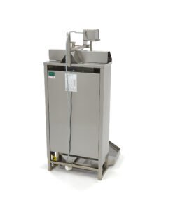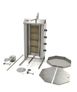 This grill is equipped with a removable stainless steel drip tray with a filter to collect fat. The grill’s motor is located at the top of the appliance. The grill is not supplied with stainless steel reflection screens, but these can be ordered separately. Because this doner kebab grill works on gas, you will receive standard nozzles for natural gas (20 – 25 mbar). The nozzles for LPG (propane/butane) are supplied separately (30 – 50 mbar) in a plastic bag together with the instruction manual. It’s advisable to call in a professional for the conversion of natural gas to LPG. You can also order a special kebab knife with which you can cut the grilled meat into slices.