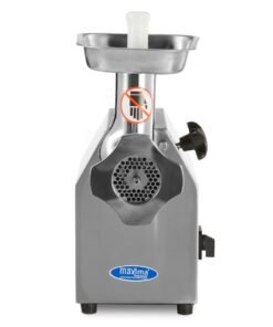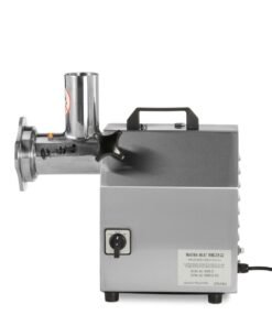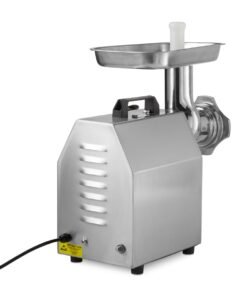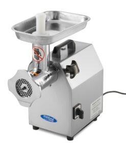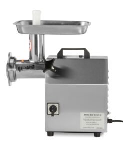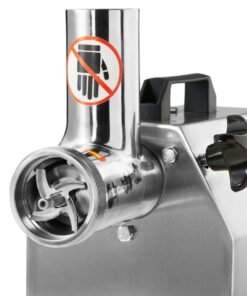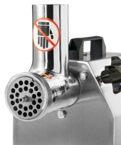 The housing of the mincer and bowl, the spiral and the screw ring are made from stainless steel. The blades and discs are made from hardened steel. Besides a sausage filler, you also receive the following accessories: a stopper, two cross blades and plates with holes of 6 and 8mm each. The input is 5,5cm and the top tray is included so you can put as much meat as you need ready to be ground. The mincer can also be set to two positions: forward and backward. It can easily produce 220kg of minced meat per hour. It’s ideal if you need large quantities of minced meat or stuffing in the kitchen. The mincer is easy to operate. First, place the required disc and then simply turn the appliance on. Use the stopper provided to push the meat towards the blades. The minced meat can be collected in a tray or bowl and is ready for use.