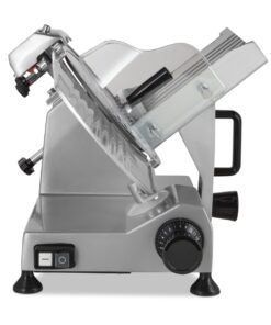 This professional meat slicer is very easy to use. On the side, you will find the on and off button. You can operate the lever with one hand, while you catch the meat with the other. Since you are working with food, the slicer should be cleaned and disinfected properly after each use. The cutting board and the blade are detachable and can be cleaned with soapy water and a mild detergent. Use a wet sponge and some detergent to clean the rest of the appliance. Before use, rinse everything and let the parts dry well. For stability during use, the meat slicer stands on four rubber feet