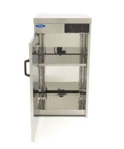 The inside of this plate warmer can be heated within the range from 30 to 85⁰C, simply by turning the temperature button. An indicator light lets you know when the exact temperature has been reached and the plates are ready to be used. The shelves inside the plate warmer are adjustable in height so you can customise it to suit your needs. It also includes a single door in front that opens and closes easily.