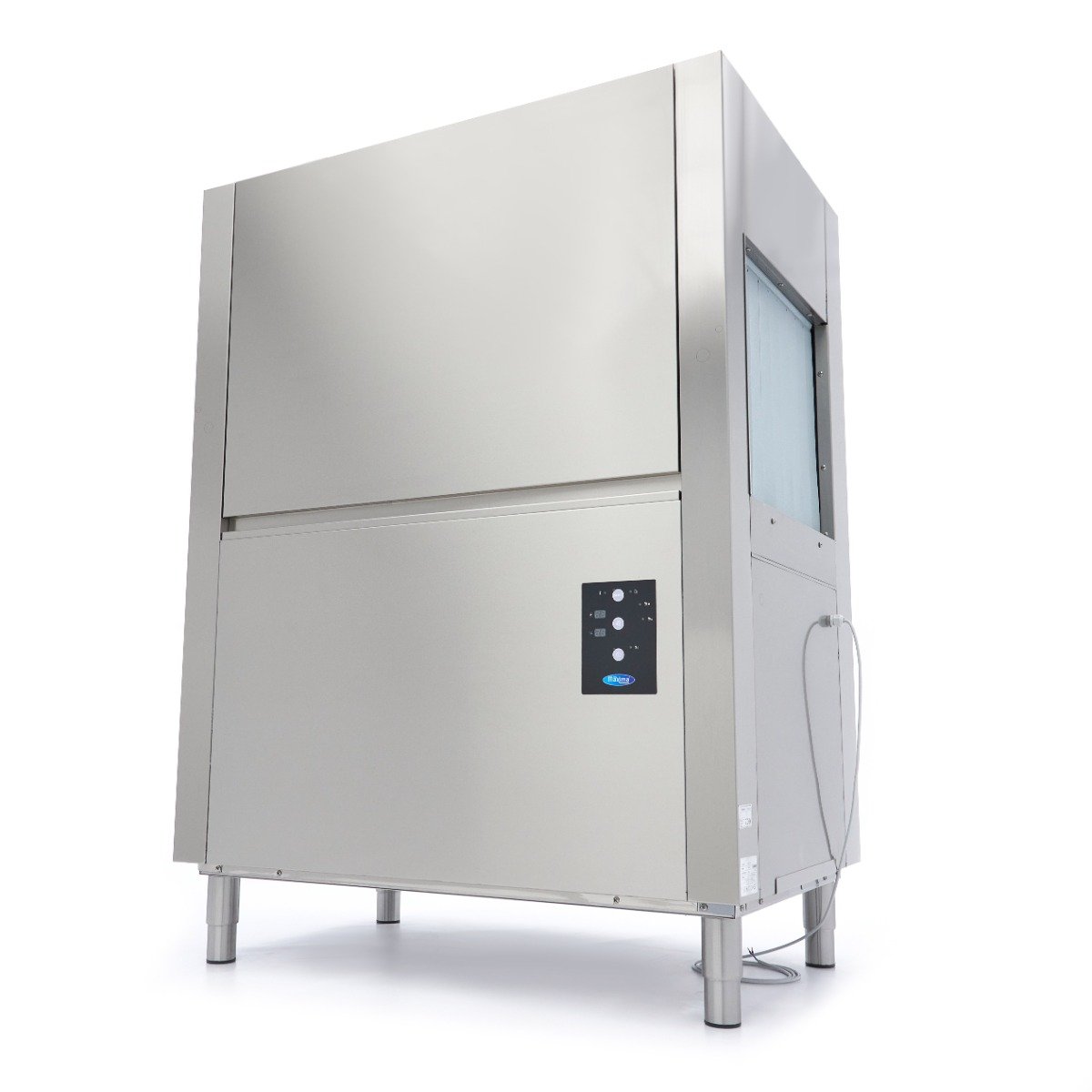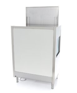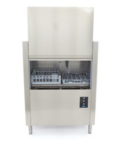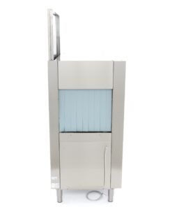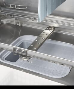 The wash temperature of this dishwasher is 60°C and the rinse cycle is 82°C, which helps everything dry faster. It’s also a very quiet machine, operating at less than 65dB. This dishwasher uses 160L of water per hour. It has a control panel that is IPX4 protected, so water can’t get behind the easy-to-use buttons. The rack conveyor dishwasher comes without a rinse and soap pump. The following accessories have been included: a 50 x 50cm glasses basket, a 50 x 50cm plate basket and a supply and drain hose to connect the appliance to the water supply. No drain pump is included because the water runs off naturally.