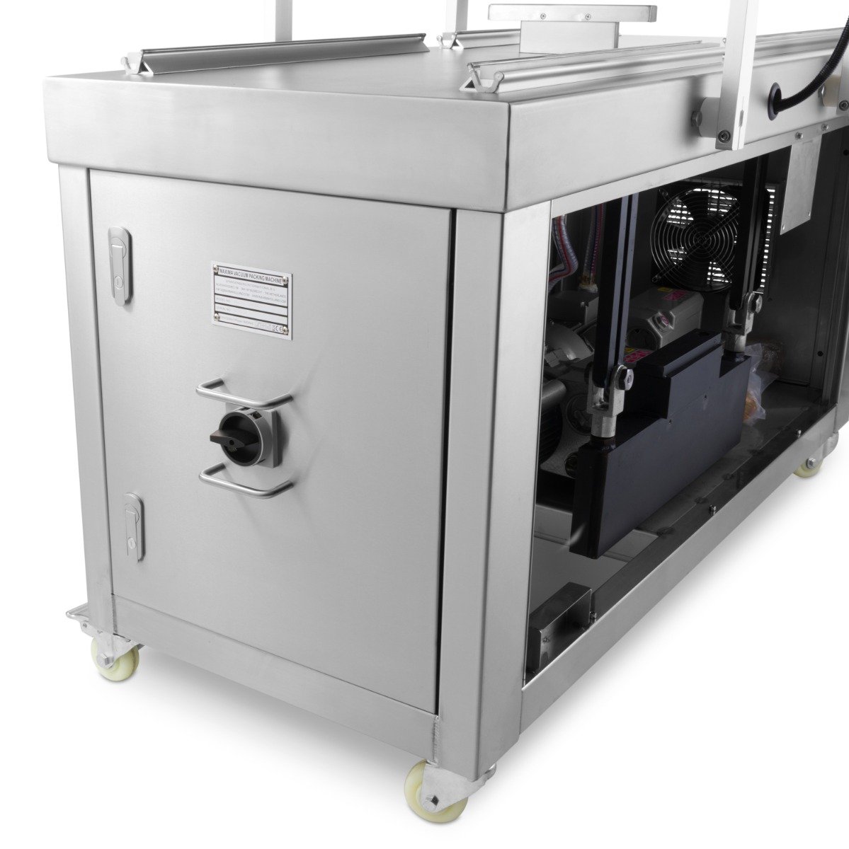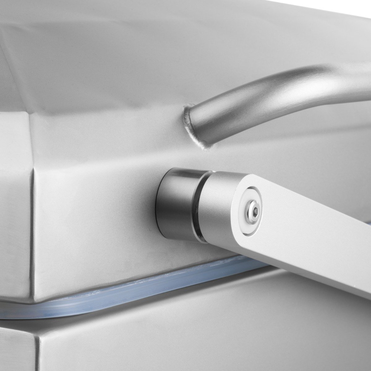 Both the housing and the inside of the packaging machine are made from stainless steel. This makes it both sturdy and very easy to clean. A damp cloth, water and a mild detergent are enough to make sure it is cleaned thoroughly. Simply wipe all the surfaces down. After cleaning, dry all parts with a soft cloth.