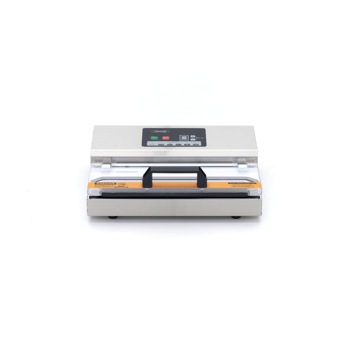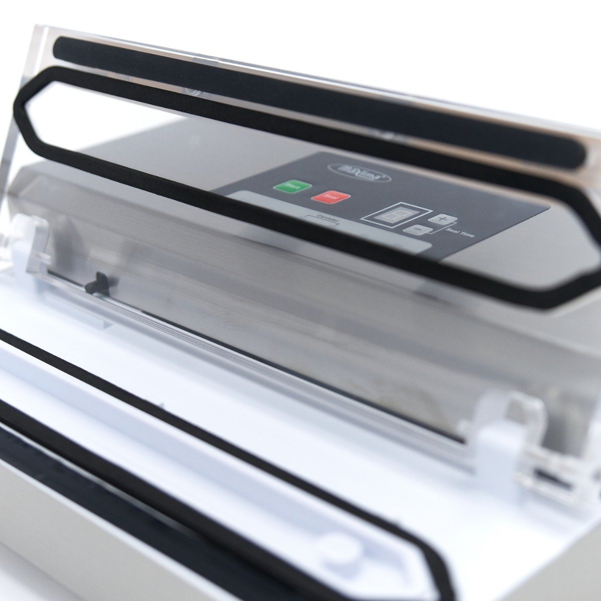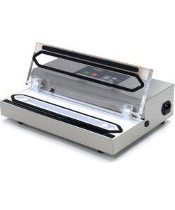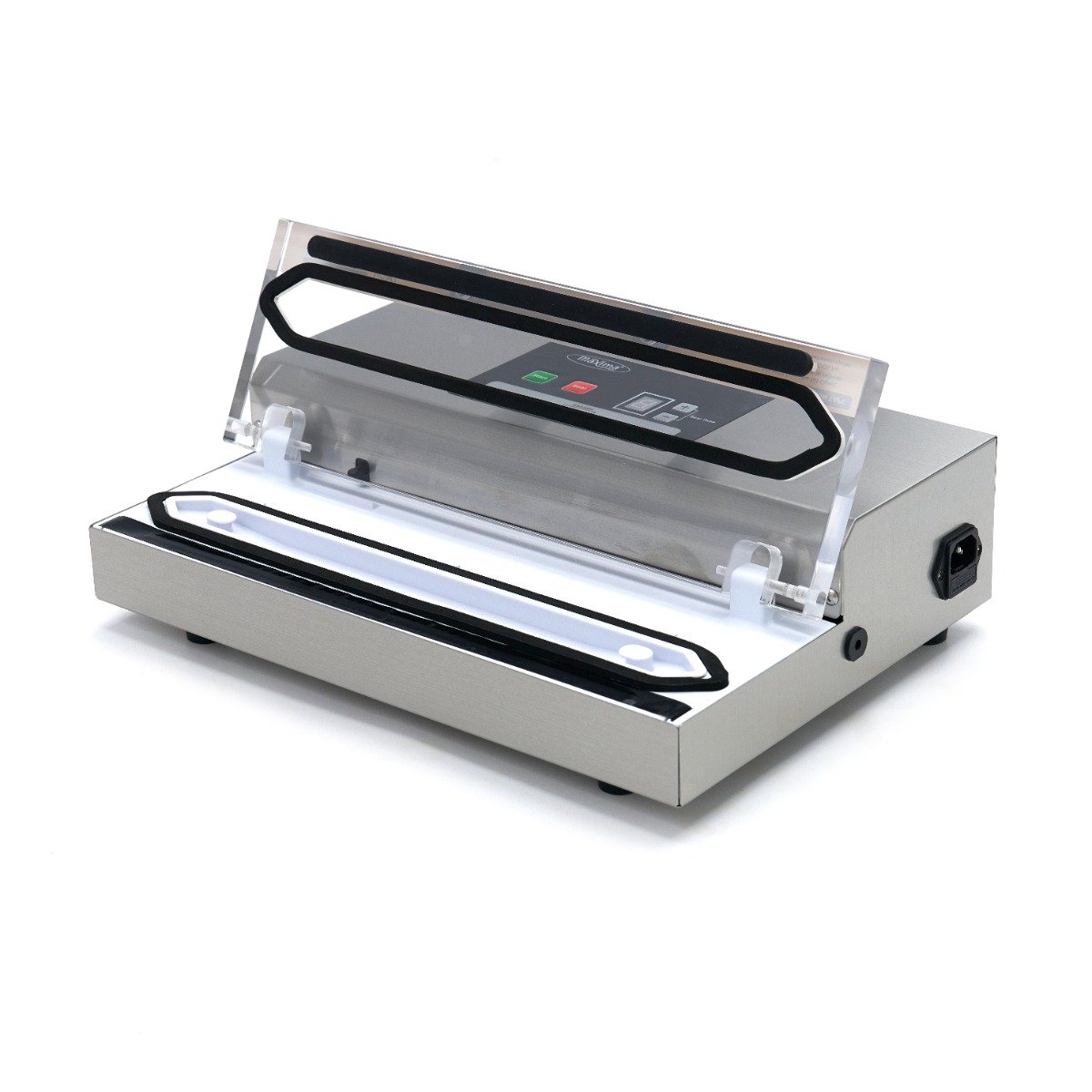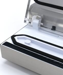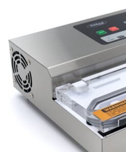 The housing of this luxury vacuum sealer is made from stainless steel. It can be cleaned with a damp cloth and a mild detergent. Do not use too much water to clean this device. The vacuum sealer stands on four rubber feet so that it stays in place when in use.