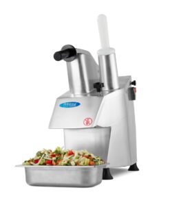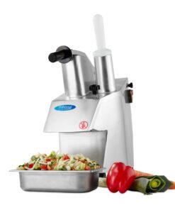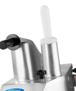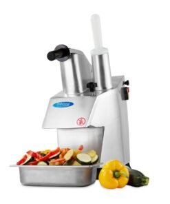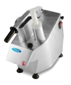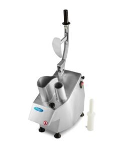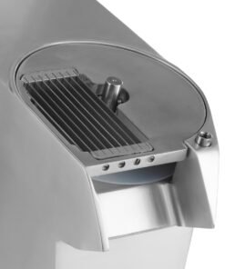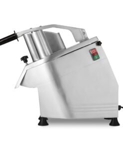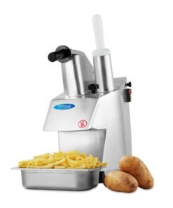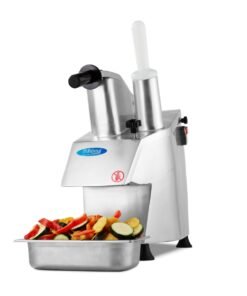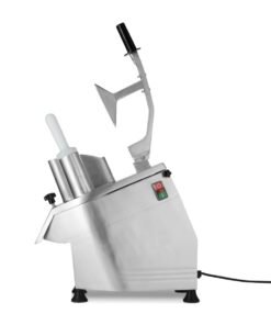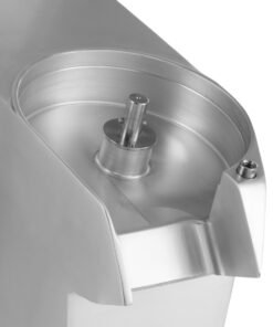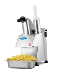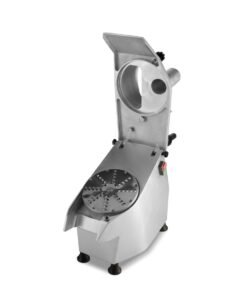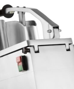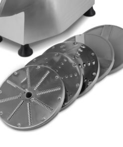 Start by washing the vegetables and fruits if necessary. Carefully select the required slicer and close the cover. Plug in the machine and push the green button to start the vegetable slicer. Lift the handle and place the vegetables and fruits in the round inlet. Push the handle down and use the food pusher to guide the vegetables/fruits towards the cutting discs. The handlebar is equipped with a safety switch, this switch will automatically stop the machine when you move the handlebar up or down. When you are done cutting the food, press the red button to turn off the machine. With the different cutting discs that come with this machine, you can slice almost any item exactly the way you need it. This machine includes cutting disks of 2 and 4mm as well as three graters of 3, 4 and 7mm. Additional slicers like julienne slicers and dicing grids for cutting fries are also available on our website. For making dices, the dicing grid should be combined with a standard slicer disc in the same size. The same also applies for cutting fries with the french fries disc.